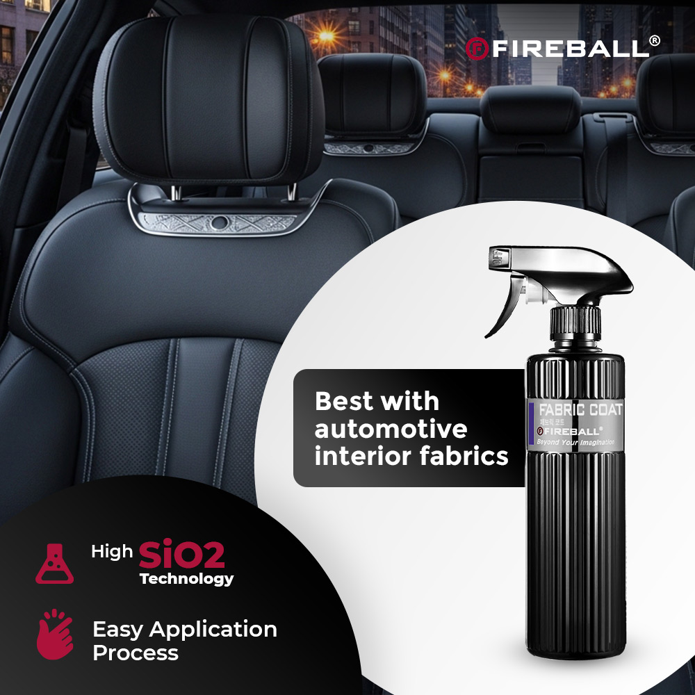 Fireball Fabric Coat is designed to protect automotive interior fabrics with a clear, non-stiffening coating. Using high SiO2 technology, it helps repel liquids, resist stains, and reduce dirt build-up while keeping the fabric’s original look and feel. Ideal for seats, synthetic fibers, and textile mats, it’s easy to apply with a spray nozzle for even coverage and long-lasting results.